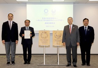 また、プロジェクトの記念として各参加自治体産の木材で作られた東京2020オリンピック・パラリンピックの木材エンブレムが披露されました。