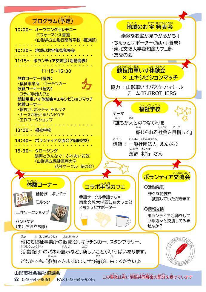 書道パフォーマンス、講演会、福祉スポーツ体験、キッチンカー、福祉事業所の販売会等(詳細はちらし裏面を参照ください。)