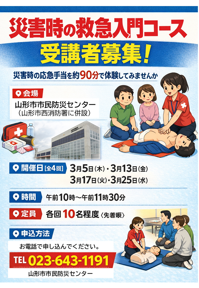 山形市市民防災センターへ電話でお申し込みください 電話(643-1191)